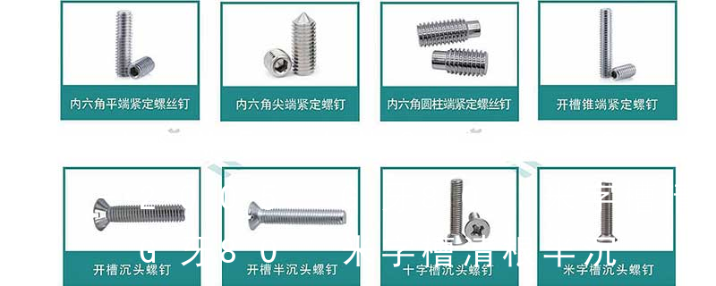 (鐵板牙自攻螺絲) B-2: Plastic Tapping Screw. (塑膠用,自攻螺絲) C: Wooden Screw : 木工螺絲 D: Drywall Screw :水泥墻螺絲 E: Self Drilling Screws鉆尾螺絲(不銹鋼鉆尾螺絲,復(fù)合材料鉆尾螺絲) F:膨脹螺絲,四片膨脹螺絲又 1.機螺釘 2.自攻螺釘 3.鉆尾螺釘 4.墻板釘 5.纖維板釘 6.木螺釘7.六角木螺釘 8.不脫出螺釘 9.組合螺釘 10.微型螺釘 11.家具螺釘 12.電子螺釘頭型:1.六角頭(hexagon head) 2.六角頭法蘭面(hexagon head with flange) 3.